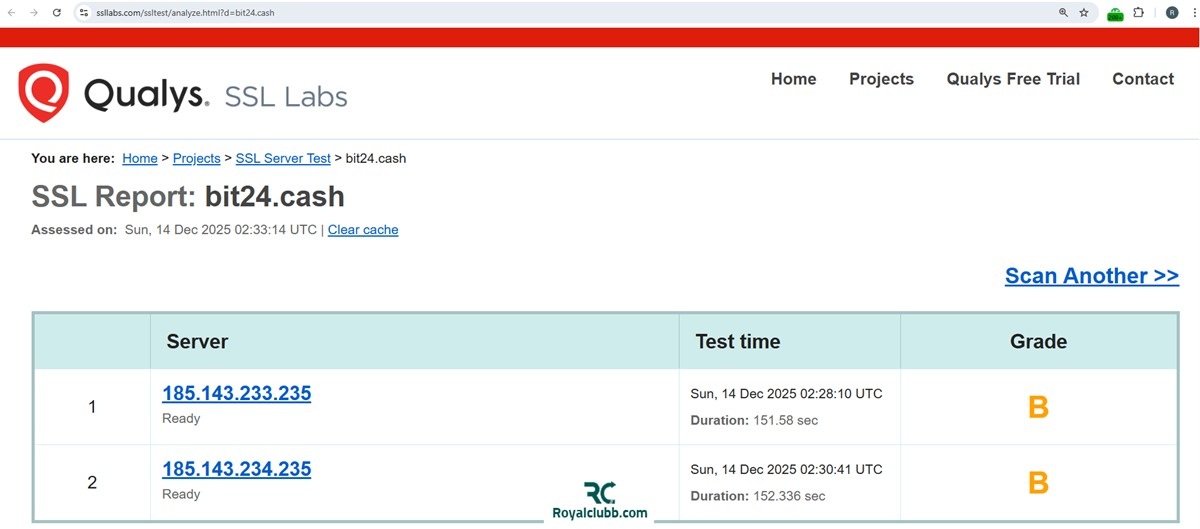 پلتفرم Qualys امنیت فنی دامنه را با دقت بالا بررسی میکند و نشان میدهد آیا سایت از نظر ارتباط کاربر–سرور امن است یا نه. بههمین دلیل دامنه "bit24.cash" را در این سایت بررسی کردیم.