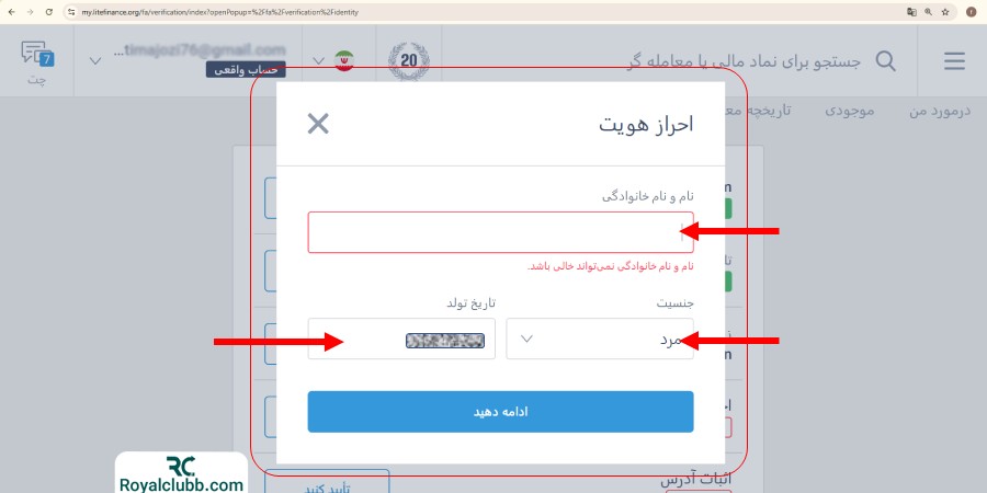 اطلاعات را صحیح و مطابق با اطلاعات هویتیتان تکمیل کنید و در نهایت روی دکمه «ادامه دهید» کلیک کنید. در ادامه یک پنجره جدید باز میشود که از شما میخواهد عکس مدارک هویتیتان مثل کارت ملی، گواهینامه یا گذرنامه را بارگذاری کنید.
